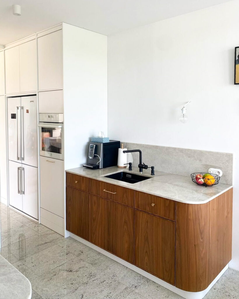 Meble na wymiar umożliwiają idealne wkomponowanie elementów wyposażenia, takich jak piekarnik, chłodziarka, zamrażarka, ekspres czy inne urządzenia. Sprzęty nie muszą już dominować we wnętrzu — stają się spójną częścią zabudowy, zachowując jednocześnie pełną ergonomię i wygodę użytkowania.